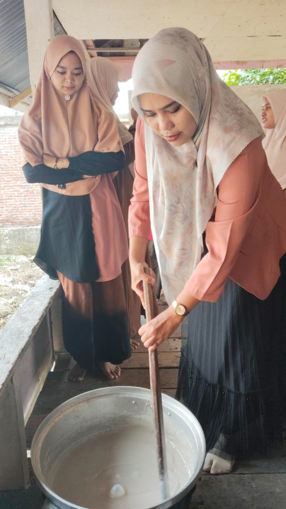 Untuk kategori penganan berbahan dasar tepung, mahasiswa mempraktikkan pembuatan doidoi, meuseukat, dan halua. Penganan ini merupakan kue tradisional Aceh yang lazim disajikan dalam berbagai acara pernikahan dan kegiatan adat. Proses pembuatannya mengajarkan ketelitian, kesabaran, serta pemahaman terhadap teknik tradisional yang diwariskan secara turun-temurun.